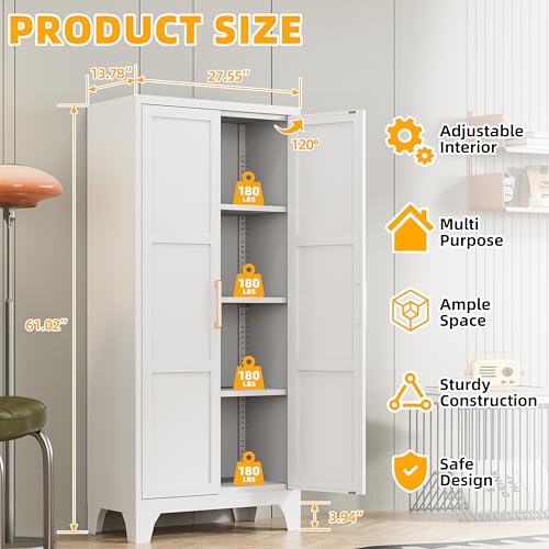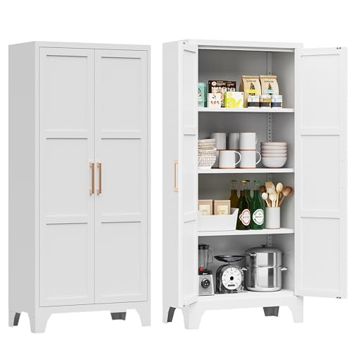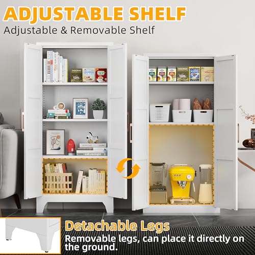 61″H Metal Pantry Cabinet with 2 Doors and 3 Adjustable Shelves,Food Storage Cabinet with Gold Handle for Kitchen,Dinning Room,Home Office,Living Room,Easy Assembly (White,61″H x13.8″D x27.6″W)