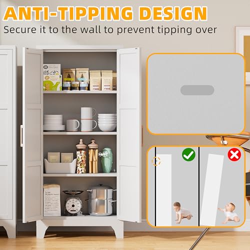 Specification: 61″H Metal Pantry Cabinet with 2 Doors and 3 Adjustable Shelves,Food Storage Cabinet with Gold Handle for Kitchen,Dinning Room,Home Office,Living Room,Easy Assembly (White,61″H x13.8″D x27.6″W)