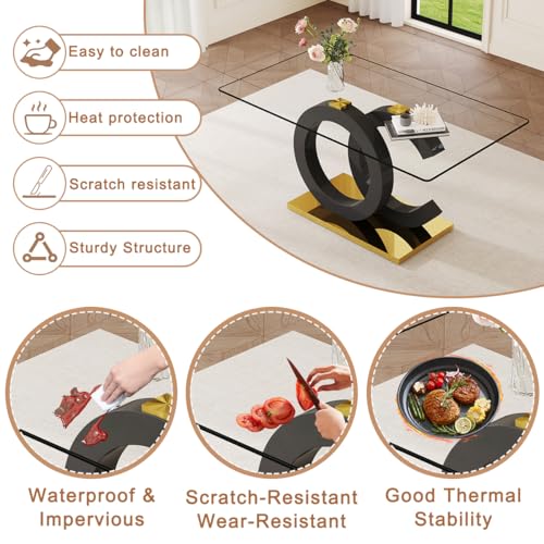 Specification: 63″ Glass Dining Table Set for 6, Modern Dining Table Set for 6, Tempered Glass Tabletop with Black OC-Shaped Legs and Gold Base, Black Gold Kitchen Table Set with 6 Cantilever Upholstered Chairs