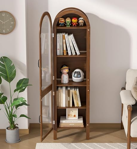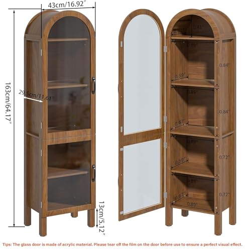 Specification: 64.17 in Tall Arched Display Cabinet with Acrylic Glass Doors 5-Tier Kitchen Pantry Storage Cabinets Modern Wood Curio Cabinet Bookcase for Living Dining Room (Walnut, 16.92‘’W)