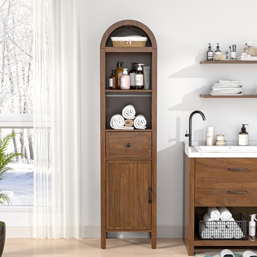 Specification: 64″ Tall Bathroom Storage Cabinet with Adjustable Shelves,Tall Narrow Arched Freestanding Tower Cabinet with Fluted Doors and Drawers,Space Saving Organizer for Bathroom Living Room (Walnut)