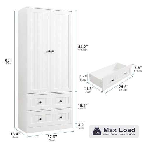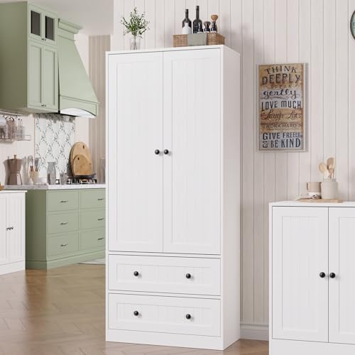 65″ H Storage Cabinet with 2 Drawers, Farmhouse Kitchen Pantry Cabinet with 2 Doors & Adjustable Shelf, Handbag Storage Organizer for Living Room, Bathroom, Kitchen, White