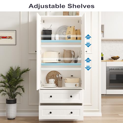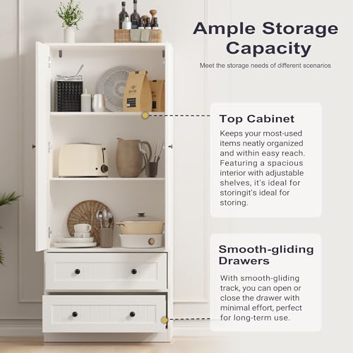 Specification: 65″ H Storage Cabinet with 2 Drawers, Farmhouse Kitchen Pantry Cabinet with 2 Doors & Adjustable Shelf, Handbag Storage Organizer for Living Room, Bathroom, Kitchen, White