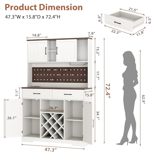 AMPLE STORAGE SPACE: This largew kitchen storage cabinet combines a buffet and upper hutch, providing abundant storage for all your needs. The upper hutch includes six adjustable shelves and a built-in wine glass rack, while the bottom buffet has six large shelves, two spacious drawers, and a detachable X-shaped wine rack for 12 bottles. Organize kitchen essentials, snacks, and liquor with ease, making it a must-have kitchen hutch for any home