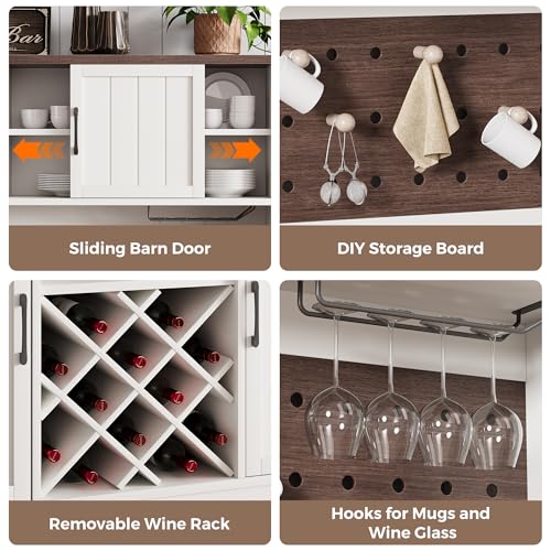 72″ Coffee Bar Cabinet with Power Outlet & LED Light, Farmhouse Large Kitchen Hutch with Sliding Barn Door, Tall Bar Cabinets with Storage Drawers & Wine Glass Rack,Pantry China Cabinet for Home,White