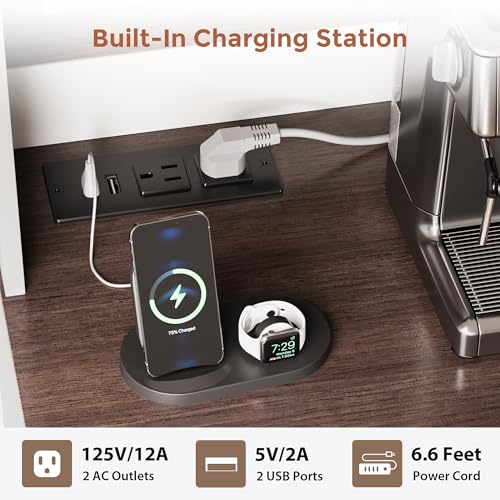 47‘’ WIDE COUNTERTOP WITH CHARGING STATION: With a 47.3-inch wide countertop, this coffee bar offers ample space for your essentials. Equipped with two AC outlets and two USB ports, it easily supports appliances like coffee makers, microwaves, and toasters. Say goodbye to outlet shortages and enjoy the convenience