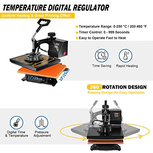 👚 360° Rotation and Guide Rail Design — With a fully rotated 360 degree swing-away and bottom guide rail design, allows the heating element to be moved safely aside, reducing the chance of accidental contact, also make it easy to replace the plate press and hat press. The bottom strong base and top pressure knob make it more stable when using, this heat press machine provides a full range press directly and evenly, guarantees the quality of finished transfers.