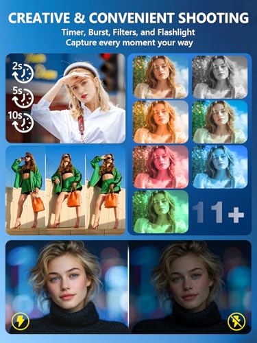 【Dual-Lens & Touchscreen Control】Equipped with both front and rear lenses, this cameras for photography makes it easy to switch between selfies, vlogs, and group shots. The built-in anti-shake and fast autofocus help deliver clearer images with less blur. A 3.2-inch HD touchscreen lets you frame your shots smoothly and operate the point and shoot digital camera with ease, perfect for beginners and everyday photography