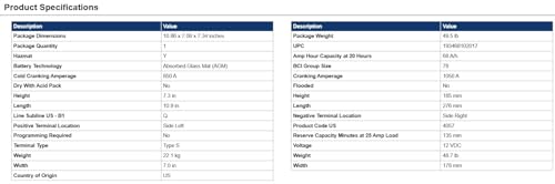 Specification: ACDelco Gold 78XAGM (88866070) 48 Month Warranty Premium AGM BCI Group 78 Battery