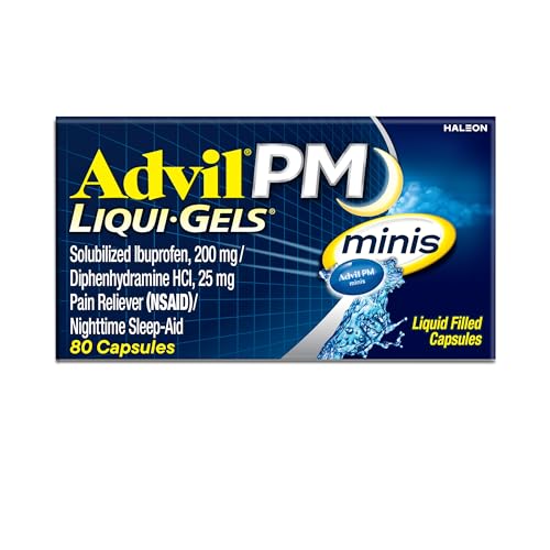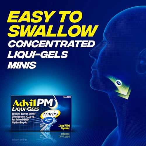Advil PM Liqui-Gels Minis deliver powerful relief in a smaller, easier-to-swallow capsule. Each liquid-filled mini capsule combines the trusted pain-relieving strength of Advil with a gentle sleep aid, helping you get the restful sleep you need. Featuring solubilized ibuprofen (200 mg) and diphenhydramine HCl (25 mg), this dual-action formula soothes nighttime aches and pains while helping you drift off to sleep faster. Perfect for those who want the same strength in a more convenient size.