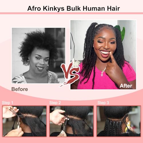 Springy Afro Twist Bulk Human Hair for Braiding Afro Kinkys Bulk Human Hair That Can be Braided, Twisted, Dreadlock Extensions, or used for Various Protective Styling Techniques, Unprocessed Human Braiding Hair That Provides Ample Volume for Full Head Styling Needs