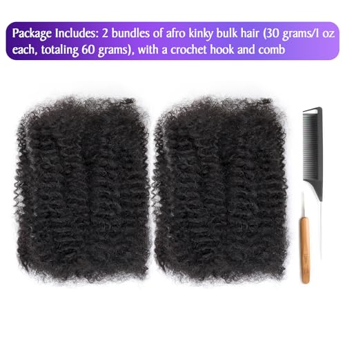 Package Includes: 2 bundles of afro kinky bulk hair (30 grams/1 oz each, totaling 60 grams), and typically 5 to 9 packs are needed for a full head of braids, along with a crochet hook and comb for easy styling.