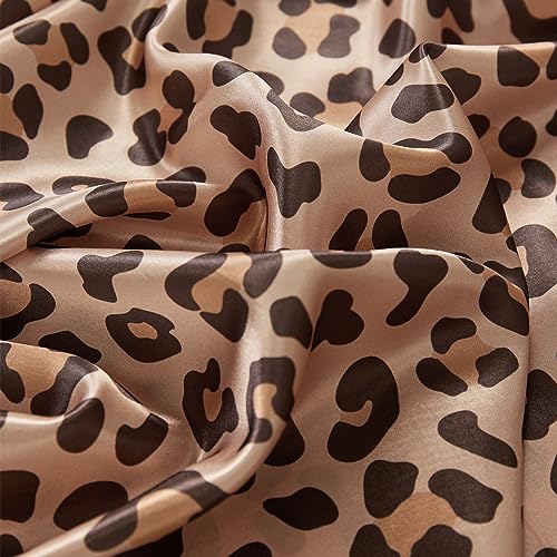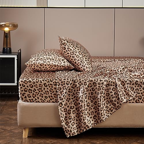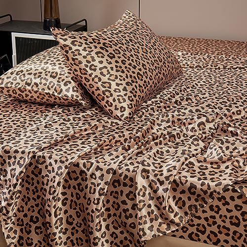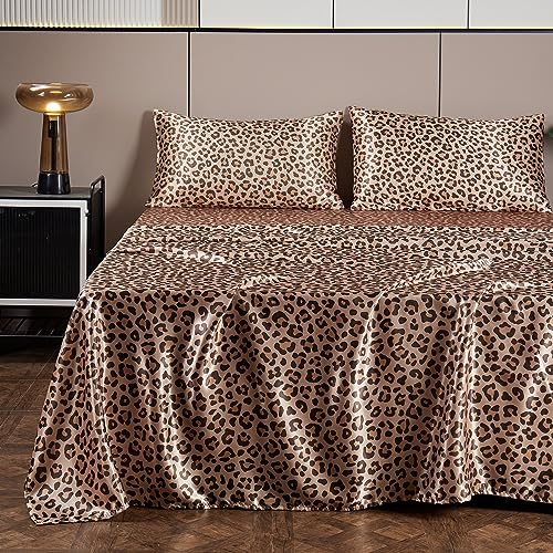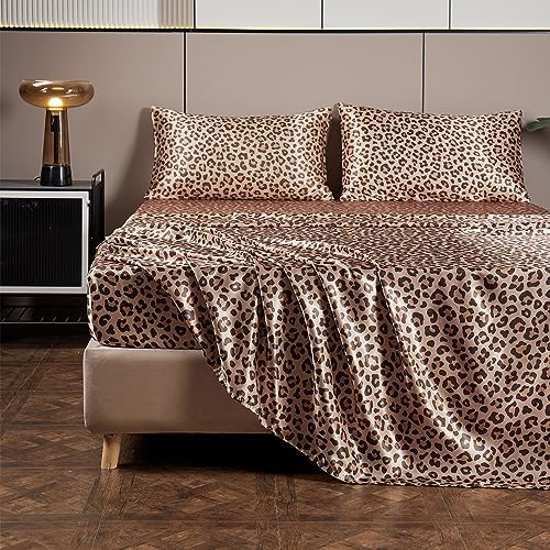 AiMay 4 Piece Queen Size Satin Bed Sheet Set Deep Pocket Golden Leopard Pattern Luxury Silky Super Soft 1 Flat Sheet 1 Fitted Sheet 2 Envelope Pillowcases Wrinkle Free (Golden Leopard, Queen)