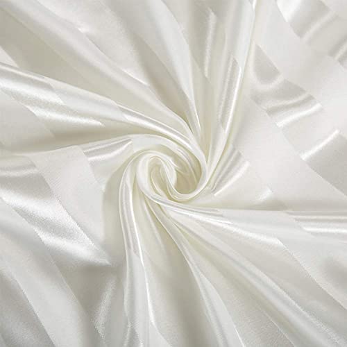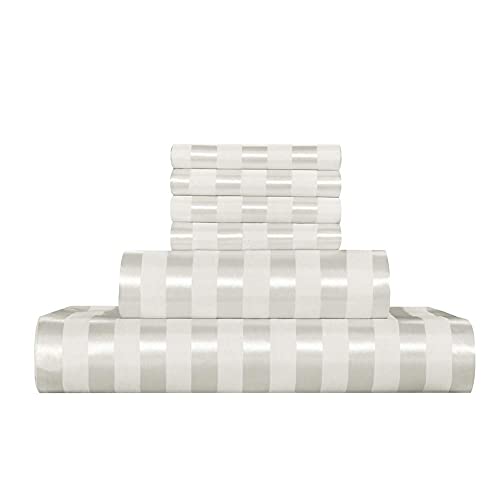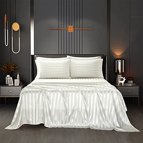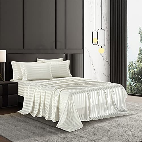 AiMay 6 Piece Satin Italian Style Bed Sheet Set Deep Pocket Striped 1800 Luxury Rich Silk 1 Flat Sheet 1 Fitted Sheet 4 Envelope Pillowcases Stain-Resistant Wrinkle Free (Queen,Off White)