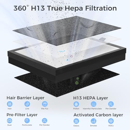 H13 True HEPA Filtration: The advanced H13 HEPA four-layer filtration system achieves a capture rate of 99.97% for particles as small as 0.3 microns and also has an excellent interception effect on particles as small as 0.1 microns. Choose our purifier and make your living space purer and more vibrant.
