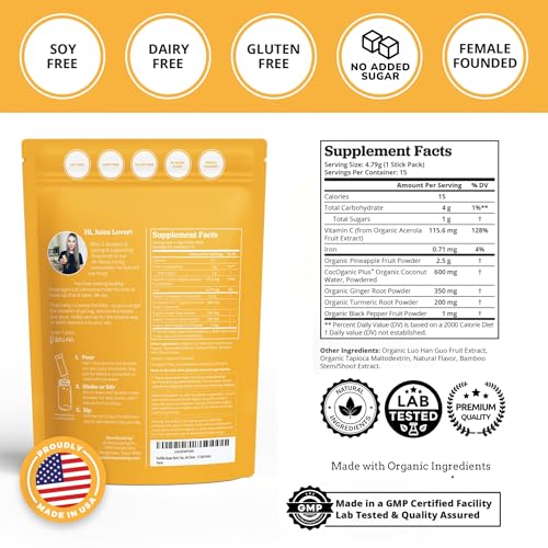 Specification: All About Juicing Ginger Shots with Pineapple & Turmeric – Superfood Juice Powder – Immunity, Digestion & Energy Support – 15 Wellness Stick Packs – PuriVibe