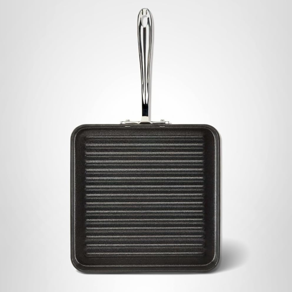 The HA1 Hard Anodized Nonstick 11 inch Square Grill features an open surface with low walls for easy flipping and raised ridges for capturing beautiful searing marks and releasing fat.