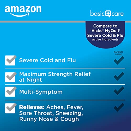 MAXIMUM STRENGTH: Amazon Basic Care Nighttime Severe Cold and Flu Relief provides maximum strength relief of headache, fever, sore throat, minor aches and pains, sinus congestion and pressure, sneezing, runny nose and cough