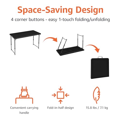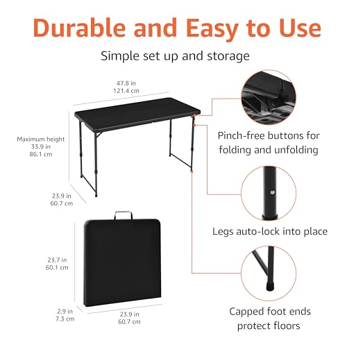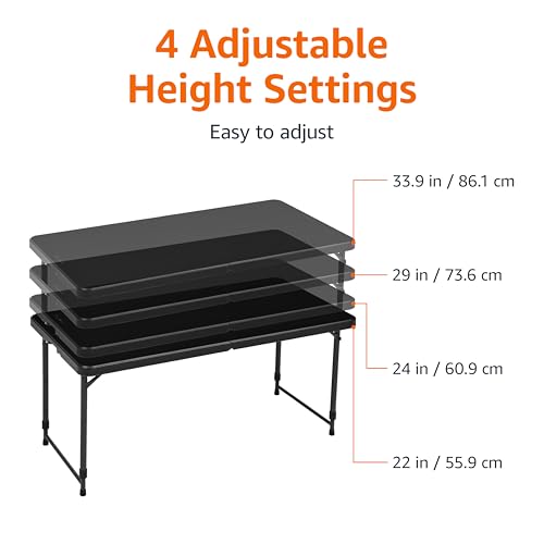 Specification: Amazon Basics 4 Foot Rectangular Folding Dining Table, 4 Adjustable Height Settings with Carrying Handle, Indoor & Outdoor, Washed Black, 47.8 x 23.9 x 33.9 in