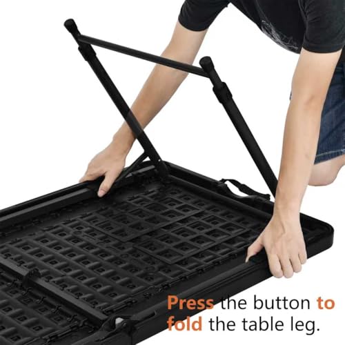 CONVENIENT PORTABILITY: 4-foot folding table features an ergonomic carrying handle and innovative fold-in-half design for effortless transportation. Perfect for quick setup and compact storage in any space.