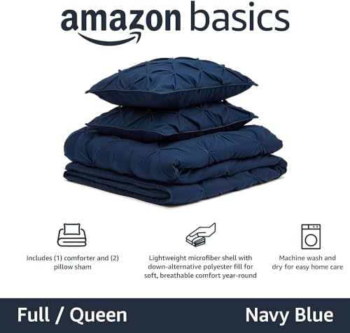 Specification: Amazon Basics Soft, Warm Down Alternative Queen Size Comforter Set, All-Season 3-Piece Bedding with Breathable Microfiber, Pinch Pleat Design, Full/Queen, Navy Blue