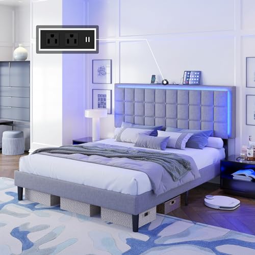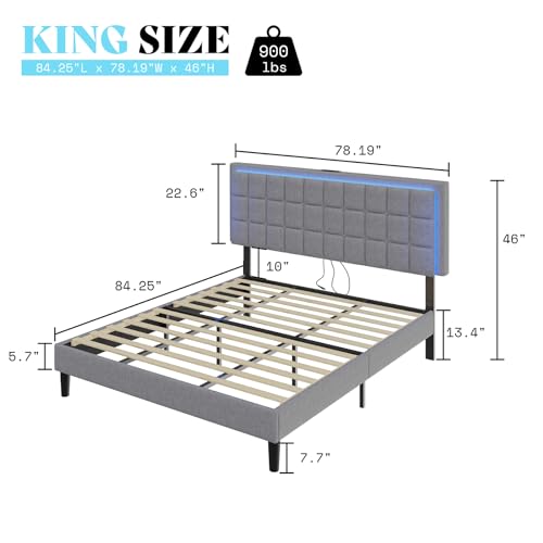 Specification: AMERLIFE King Size Button Tufted Platform Bed Frame with LED Lights, Upholstered Bed Frame with Charging Station, Wood Slat Support, Mattress Foundation, Light Grey