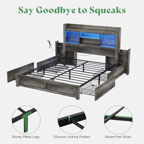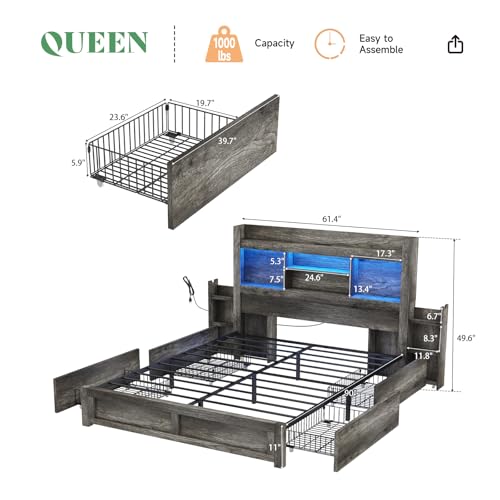 Specification: AMERLIFE Queen Bed Frame with 4 Storage Drawers, LED Bed Frame with 49“ Tall Bookcase Headboard, Wood Platform Bed with Charging Station & 2 Slide Bedside Shelf, No Box Spring Needed/Rustic Grey