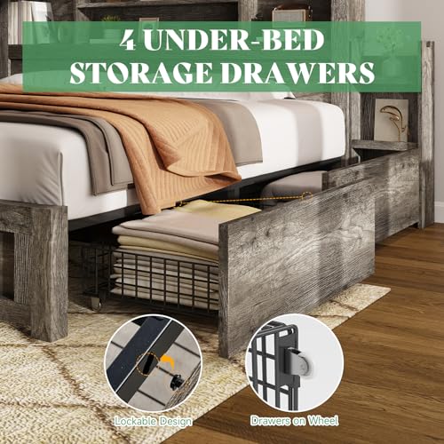 AMERLIFE Queen Bed Frame with 4 Storage Drawers, LED Bed Frame with 49“ Tall Bookcase Headboard, Wood Platform Bed with Charging Station & 2 Slide Bedside Shelf, No Box Spring Needed/Rustic Grey