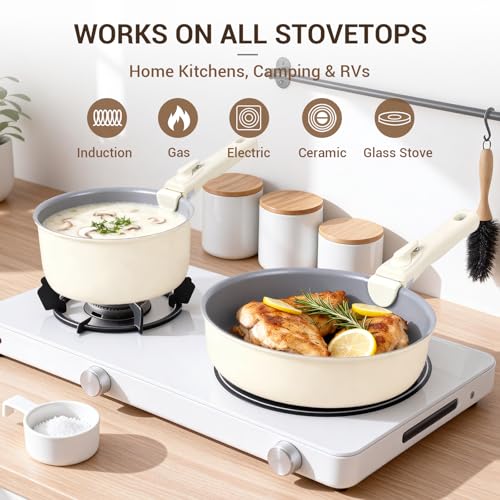 Superior Non-Stick Performance: Our cream non stick pots and pans set delivers exceptional non-stick results with minimal oil for healthier meals. Food releases completely effortlessly, making cleanup quick and simple. For best performance, we recommend using low to medium heat