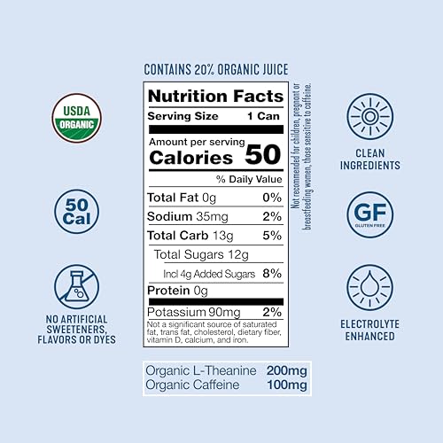 Better for You Energy Drink with Caffeine + L-theanine for Energy & Focus: Certified Organic and made with 100mg of natural caffeine + 200mg L-Theanine extracted from premium green tea leaves to sharpen focus & boost energy. The 2:1 ratio of L-theanine to caffeine supports focus and alertness while eliminating the jitters and anxiety sometimes associated with caffeine.