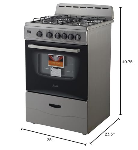 Specification: Avanti Gas Range Oven, Compact Freestanding Design, 4 Sealed Burners with Electronic Ignition, 2.6 Cu.Ft. Capacity Features Glass Door Storage Drawer Broiler and Accessories, 24-Inch, Stainless Steel