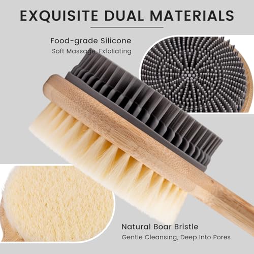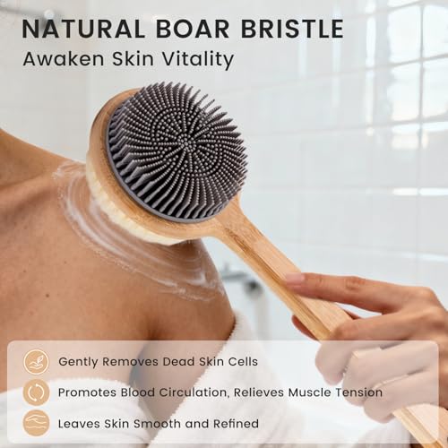 Specification: Back Scrubber for Shower – Double-Sided Silicone and Super-Dense Bristles for Deep Cleaning & Exfoliation, Bamboo Long Handle with Wider Anti-Slip Grip, Body Exfoliator for Wet or Dry Brushing