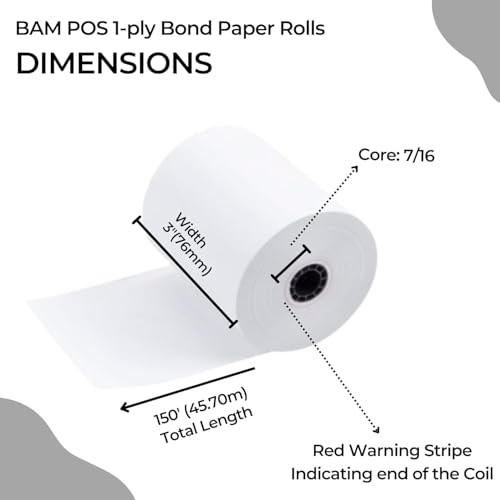 Specification: BAM POS 3″ x 150′ 1ply Bond Receipt Paper Rolls for Kitchen Impact Printers TMU200 SRP275 Star SP700 Suitable For Printing Kitchen Tickets and Order Receipts (24 Rolls Per Case)