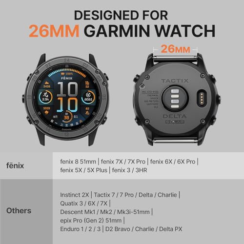 【Compatible Models & Adjustable Size】Designed for Garmin Fenix 6X Watch Band, the replacement straps are compatible with Garmin Fenix 8 51mm /7X & 7X Pro / 6X & 6X Pro / 5X & 5X Plus / 3 & 3 HR /Instinct 2X & 3 50mm /D2 Bravo & Charlie & Delta PX & Mach 1 Pro /Descent Mk1 & Mk2 & Mk2i & Mk3i-51mm /Enduro 1 2 3 /Epix Pro (Gen 2) 51mm /Quatix 3 & 6X & 7X & 8 51mm /Tactix 8 51mm & 7 Pro & Bravo & Charlie & Delta. (Not compatible with other models not mentioned)