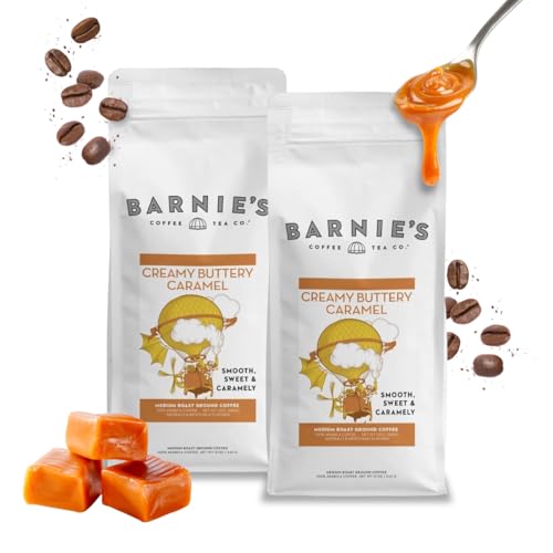Barnie’s Creamy Buttery Caramel Ground Coffee with Smooth and Sweet Caramel Flavor, Medium Roasted Arabica Coffee Beans, Gluten and Nut Free, 12 oz Bag (Pack of 2)