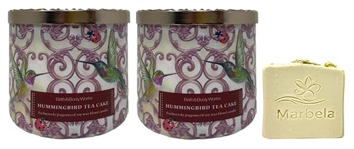 Bath & Body Works Hummingbird Tea Cake 3-Wick Candle 2 Pack with a Marbela Wild Jasmine Bar Soap