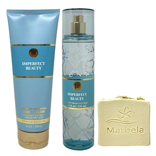 Bath & Body Works Imperfect Beauty Body Cream and Fragrance Mist Duo Set with a 4 oz Marbela Wild Jasmine Bar Soap (Ingredients: Saponified Oils of: Chamomile Oil, Olive Oil, Organic Virgin Coconut Oil, Shea Butter, Castor Oil, Vitamin E, Mica, Chamomile Flowers, Kaolin Clay, Fragrance, Titanium Dioxide, Ylang Ylang Essential Oil).