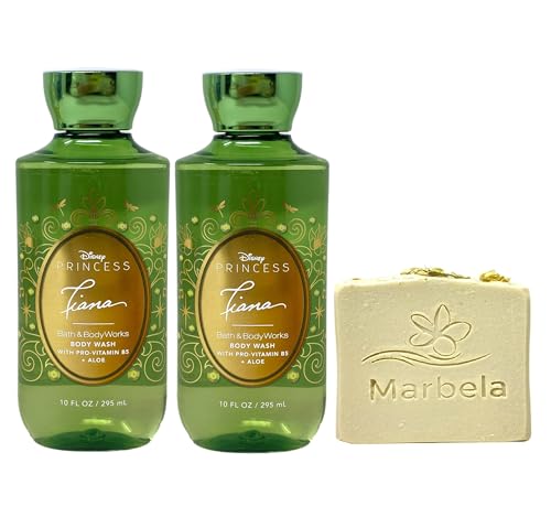 Bath & Body Works Princess Collection Tiana 2 Pack Body Wash Set – with a 4 oz Marbela Wild Jasmine Bar Soap (Ingredients: Saponified Oils of: Chamomile Oil, Olive Oil, Organic Virgin Coconut Oil, Shea Butter, Castor Oil, Vitamin E, Mica, Chamomile Flowers, Kaolin Clay, Fragrance, Titanium dioxide (natural colorant) / Ylang Essential oil).