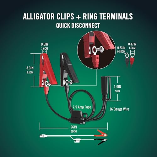 Includes: 12V, 750mA battery charger and battery maintainer with 12-foot output cord, fused-ring terminal harness for hard-to-reach batteries and alligator clip accessory cables, 5-year warranty, and lifetime customer support