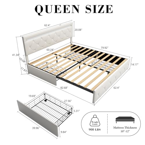 Specification: Bed Frame Queen Size with Storage Drawers and LED Light, 2 Sockets and 2 USB Ports, Adjustable Headboard with PU Leather Upholstered, No Box Spring Needed, Wooden Slats Support, White.