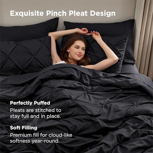 Bedsure Queen Comforter Set Black – Bed in a Bag Queen Size Bedding 7 Pieces, GentleSoft™ Pintuck Bed Set Gift for Family, Pinch Pleat All Season Comforter with Sheets, Pillowcases & Shams