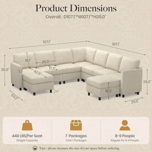 Specification: Belffin 107.1″ 9 Seats Modular Sectional Sofa U Shaped Couch Big Corner Washable Sectional Couches for Living Room Comfy Couches with Storage Deep Seat Couch Sofas with Chaise,Beige