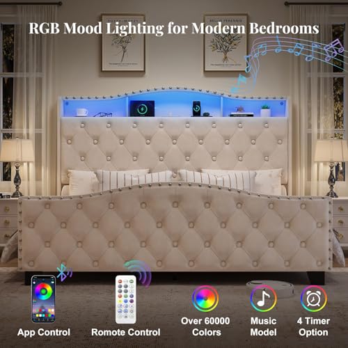 Belffin Queen Size Bed Frame and Headboard, 50.9″ Velvet Upholstered Wingback Bedframe with LED Lights & Storage/Charging Station, Button Tufted Tall Footboard, No Box Spring Needed, Noise-Free, Beige