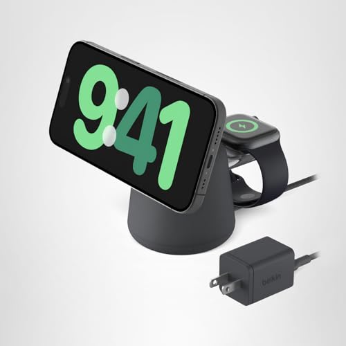 Belkin 2-in-1 MagSafe Wireless Charging Dock 15W Fast Charge iPhone Charger Compatible with iPhone 17, 16, 15, and 14 Series, AirPods, Pixel 10, and Other MagSafe Enabled Devices, PSU Included – Black