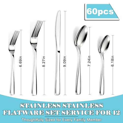 【Complete 60-Piece Set for 12】Our silverware set for 12 has 12 each of dinner knives, forks, spoons, salad forks, and teaspoons—all you need to serve family or guests elegantly and easily. This comprehensive cutlery set turns daily meals into special moments,, whether you’re hosting a holiday gathering or enjoying a weeknight dinner. Designed specifically for families, this stainless steel silverware set ensures everyone has the right utensil, keeping dining organized and enjoyable