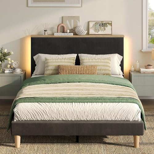 Specification: Bestier Queen Bed Frame with Adjustable Headboard & LED Lighting, Corduroy Upholstered Platform Bed Frame with Storage Shelf, Solid Wood Slats, No Box Spring Needed, Never Squeak, Easy Assembly, Black