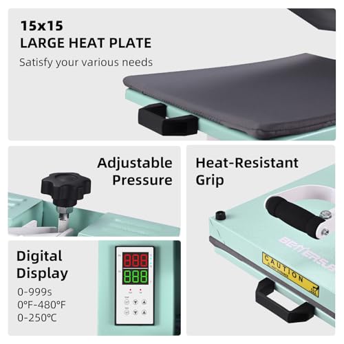 Specification: BetterSub 15‘’x15‘’ Industrial Heat Press Machine for T-Shirts, Sublimation, Transfers – Digital LCD Control, Teflon Surface, Clamshell Design, Safe & Durable (Teal)