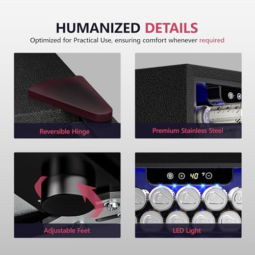 【Thoughtful Details for Stylish Display】 This mini fridge for dorm features a fully reversible door for hassle-free installation in any space, paired with soft blue LED lighting that highlights your drink collection with elegant ambiance, making every drink retrieval a stylish experience.