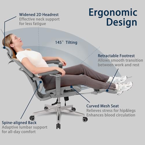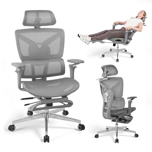 Big and Tall Ergonomic Office Chair with Footrest, 5D Adjustable Armrests, Lumbar Support, Mesh Reclining Swivel Chair for Home Office or Gaming, Adjustable Seat Depth, S3 Elite Pro Grey