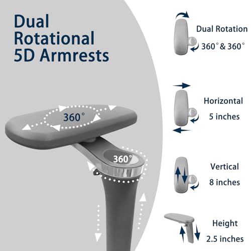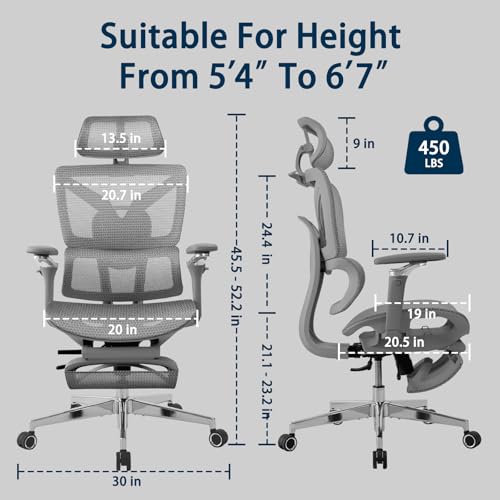 Specification: Big and Tall Ergonomic Office Chair with Footrest, 5D Adjustable Armrests, Lumbar Support, Mesh Reclining Swivel Chair for Home Office or Gaming, Adjustable Seat Depth, S3 Elite Pro Grey